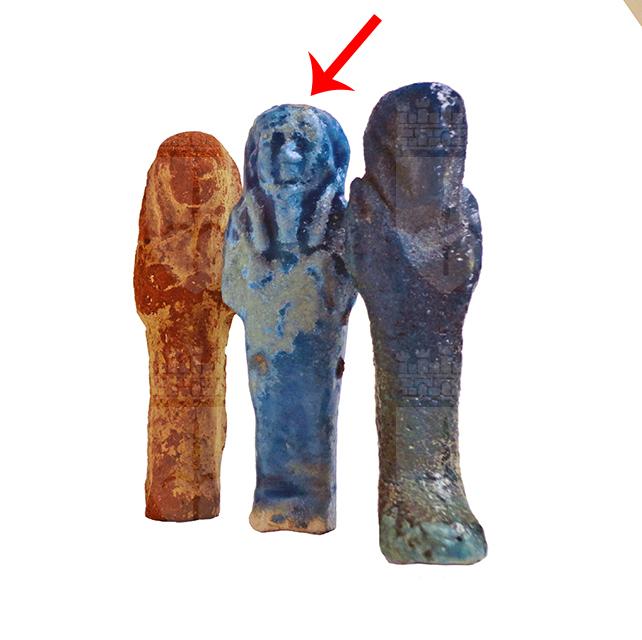 Statuina funeraria mummiforme che indossa la barba divina e una gonfia parrucca tripartita, la quale nella parte posteriore è stata rifinita, ma risulta comunque piatta. Le braccia sono incrociate e le mani portano ognuna una zappa. L’ushabti è privo di iscrizioni ed è probabile che sia servito come amuleto.