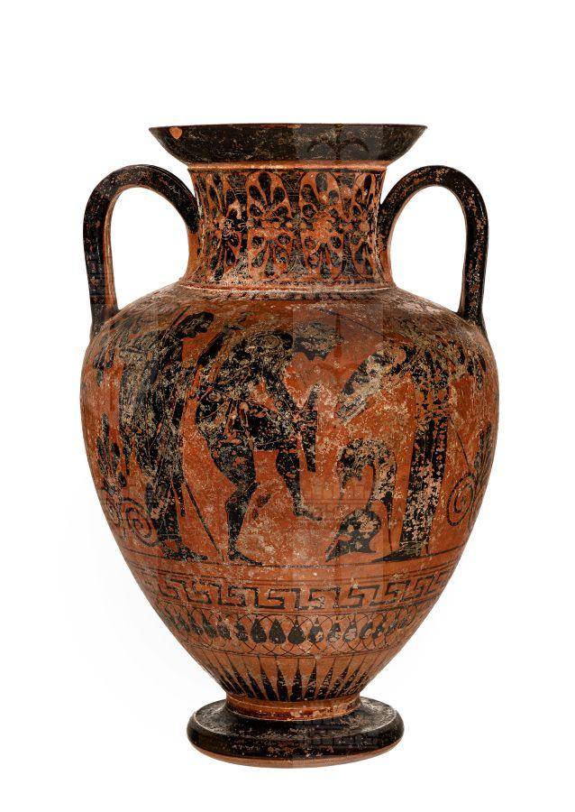 Anfora a figure nere con colori aggiunti e graffito. Lato A: Una quadriga è raffigurata di prospetto: sul carro si intravede l’auriga e alle sue spalle un guerriero con elmo corinzio che impugna due giavellotti e il kentron. Lato B: Un uomo anziano stante si appoggia a un bastone e porge una spada al giovane guerriero, armato di corazza, che si china per indossare il secondo schiniero, mentre il suo elmo attico è ancora a terra; a destra, una donna gli porge la lancia e lo scudo concavo. Sotto la base è inciso il marchio con lettere in legamento: HP