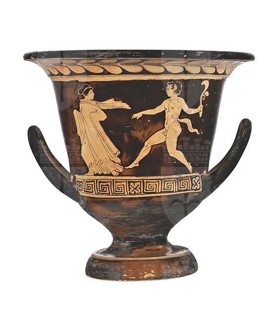 Argilla color camoscio (7.5 YR 6/4 Munsell); vernice lucente, in alcuni punti diluita con qualche scalfittura; arrossamento in vaste zone per un'errata cottura, specialmente sul bordo interno dell'orlo, al centro della scena del cd. lato A e sul piede. Il vaso presenta una larga imboccatura con orlo estroflesso distinto e labbro arrotondato; il corpo svasato poggia su un piede troncoconico con corto stelo. Presenta alte anse a bastoncello, impostate sul ventre e incurvate verso l'alto. Decorazione del lato A: è raffigurata una menade inseguita da un satiro.La menade, con le braccia leggermente piegate, corre verso sinistra guardandosi dietro; porta i capelli raccolti sulla nuca racchiusi da una sottile fascia, è vestita con un lungo chitone coperto da hymathion che svolazza per la corsa. Il satiro, rappresentato nudo con coda ed orecchie equine, corre a sua volta verso sinistra, e sembra spostarsi sulle punte dei piedi, mentre regge con la mano sinistra un elemento vegetale. Decorazione del lato B: sono raffigurati due giovani ammantati a colloquio, ritratti stanti e di profilo, l'uno di fronte all'altro e rivolti verso il centro della scena. Entrambi hanno il baricentro spostato all'indietro con il peso che poggia su una sola gamba, mentre l'altra è leggermente piegata, a riposo. Il giovane a sinistra si appoggia con il braccio destro, libero dall' hymathion, a un bastone. Tra i due, in alto sullo sfondo, una tenia appesa. La decorazione accessoria esterna è costituita, sotto il labbro, da un tralcio di foglie di olivo, incorniciato da due fasce risparmiate, di cui quella superiore è incastonata all'interno di una sottile modanatura. La parte sottostante le scene figurate, inoltre, è arricchita da un meandro interrotto da quadrati in cui sono inscritti una croce di S. Andrea e quattro trattini. Una sottile fascia risparmiata decora il bordo superiore dello spessore del piede. La zona tra gli attacchi delle anse e la parte interna delle anse sono risparmiate. All'interno si notano due fasce risparmiate, di cui la prima - sottile - corre lungo il punto in cui si imposta l'orlo; l'altra, più spessa, si trova all'altezza del punto in cui, sulla parete esterna, comincia la scena figurata.