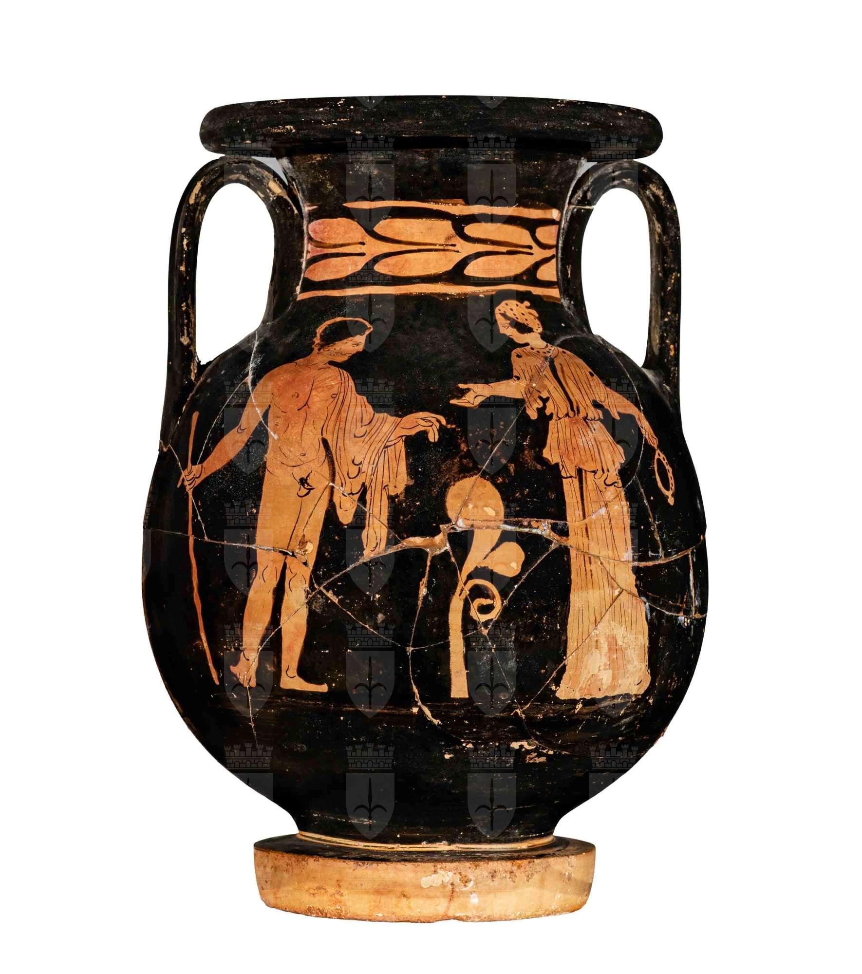 Pelike apula a figure rosse. Lato A: giovane nudo con bastone, figura femminile con serto. Lato B: due figure maschili ammantate.