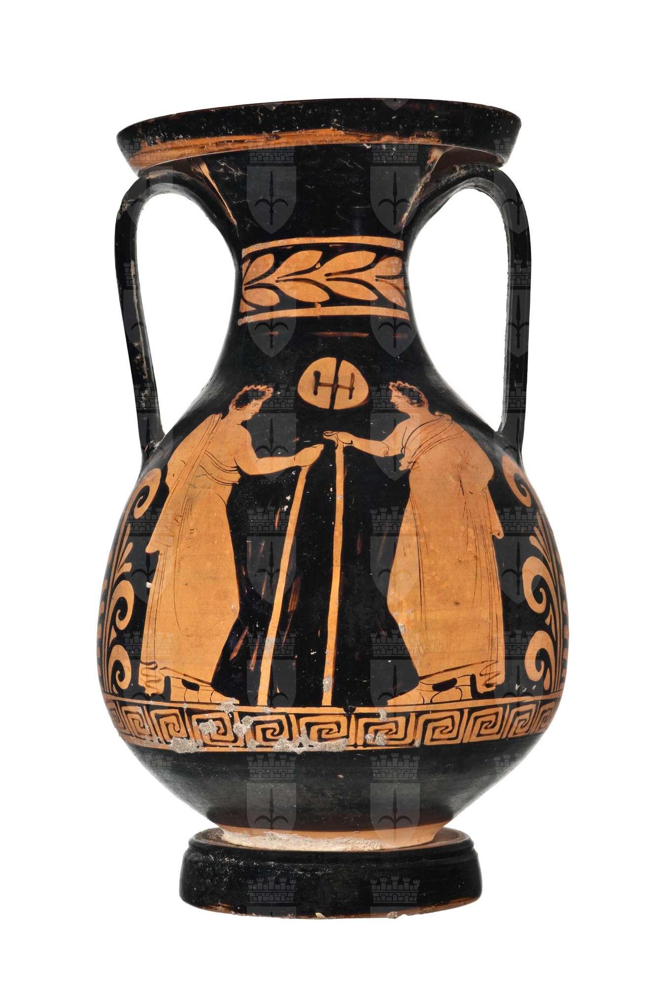 Pelike apula a figure rosse, palmette sotto le anse. Lato A: figura femminile vestita di chitone con timpano e tirso, dettagli in bianco: efebo nudo seduto con tirso e patera con serto. Lato B: due giovani ammantati con bastone.