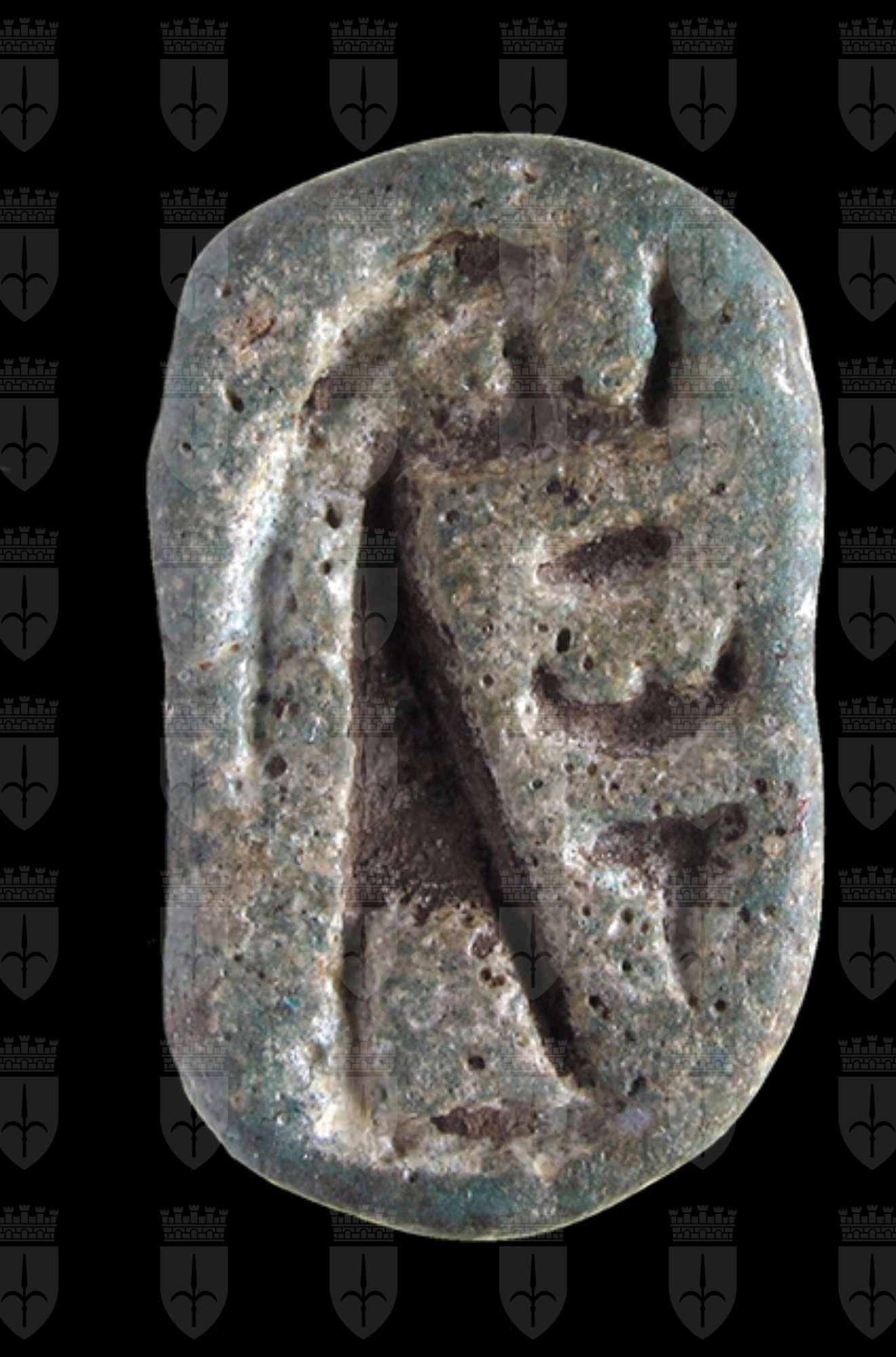 Sigillo in faience, con la raffigurazione di una figura femminile in atto di adorazione, davanti ad una tavola per offerte. Il dorso è decorato con striature parallele. La faïence in origine era di colore verde chiaro. Presa trasversale sul dorso.