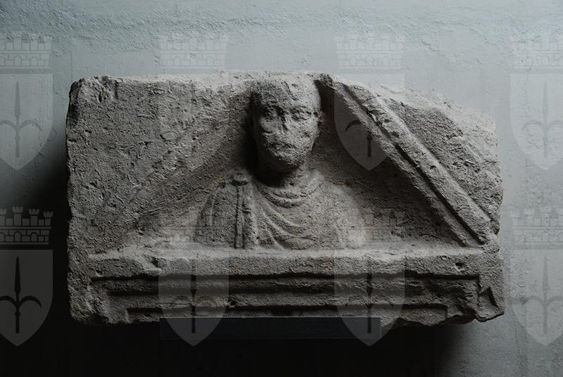 Parte superiore di stele rettangolare nel quale è realizzato a sottosquadro un frontone modanato in cui è il busto di un uomo che indossa tunica e mantello, fissato alla spalla con una fibula rotonda.
