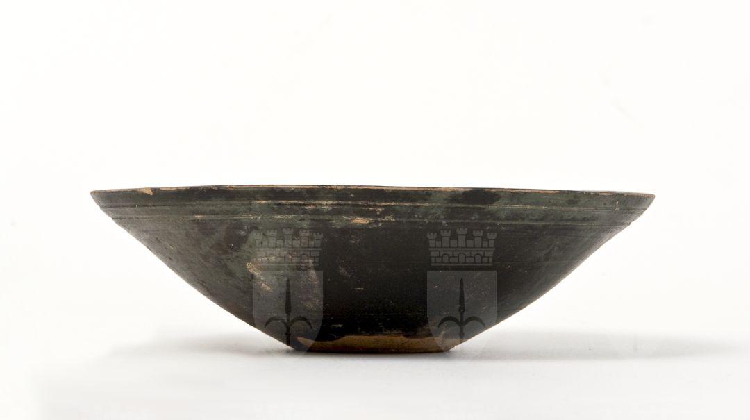 Coppa emisferica con pesci a vernice nera, a tratti più chiara e tendente al rosso, con sovraddipinture in bianco crema, giallo ocra e rosso amaranto ed incisioni. Orlo dritto, con doppia scanalatura al di sotto, vasca poco profonda, apoda. Interno della vasca: stella o fiore dai petali aperti ed espansi sovraddipinta su un bottone centrale. Sulle pareti tre delfini alternati a tre palmette con fiori di loto. I solchi incisi vanno a distinguere l’orlo dal corpo ed il fondo delle pareti della vasca, rimarcati da fasce in rosso amaranto.