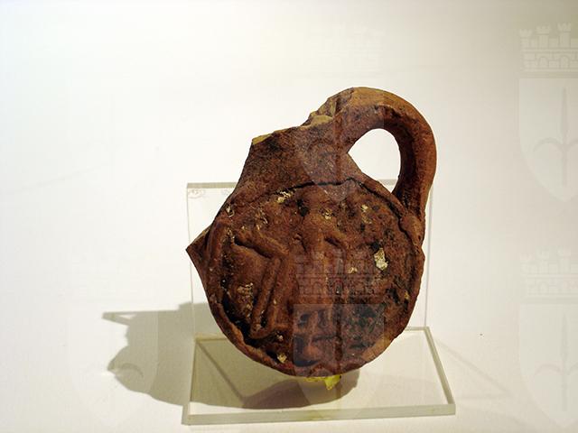 Ampolla piatta in argilla nocciola rosata, priva del collo e di un’ansa, con una fenditura alla base del collo sul lato A. Ottenuta da matrice abbastanza fresca. Sulla faccia A, entro un medaglione delimitato da un solco poco profondo, vi è l’immagine di San Menas orante tra i due cammelli, con due croci ai lati della testa del santo. Sulla faccia B vi è invece una croce apicata e raggiata.