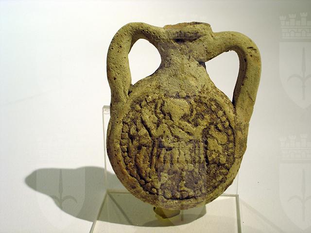 Ampolla piatta in argilla chiara, mancante del collo e ottenuta da matrice consunta. Sul lato A, entro una cornice perlinata, si vede San Menas, in abito militare e in atteggiamento di preghiera. La testa è incorniciata da un nimbo; ai lati del corpo vi sono due cammelli, stretti lungo il margine del medaglione. Sul lato B, entro una corona d’alloro con foglie stilizzate, vi è un’iscrizione in quattro righe e conclusa tra tre piccole sfere a rilievo. Solo la prima delle righe è leggibile: EVΛO, l’inizio della parola “eulogia”.