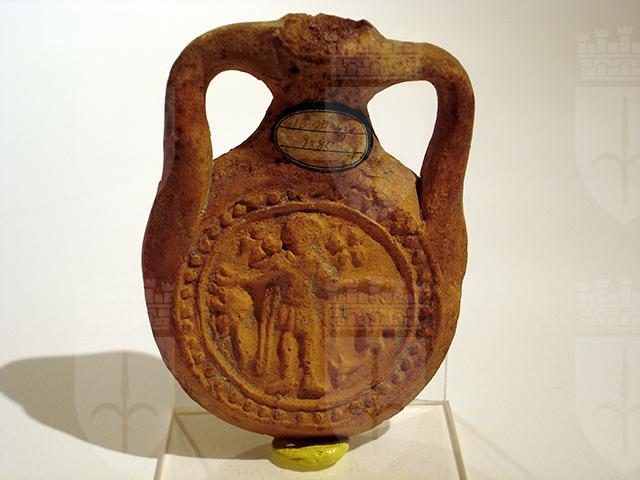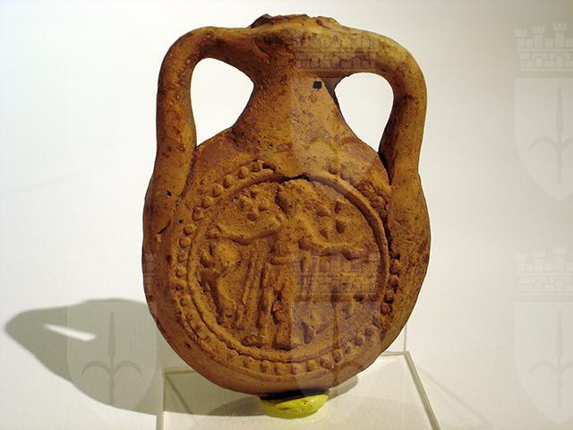 Ampolla piatta in argilla nocciola rosata con tracce di ingobbiatura di colore scuro e priva del collo; ottenuta da matrice abbastanza fresca. Su entrambi i lati dell’ampolla, entro una cornice di perline rilevate tra due anelli, vi è la medesima scena: il santo è raffigurato al centro, in posizione di orante, tra due cammelli (di dimensioni diverse). Sul lato A, attorno al capo del santo vi sono due croci greche a globetti, di cui quella a sinistra è più piccola; sul lato B le due croci sono a forma di piccolo fiore a quattro petali. Il livello di dettaglio delle incisioni è notevole.