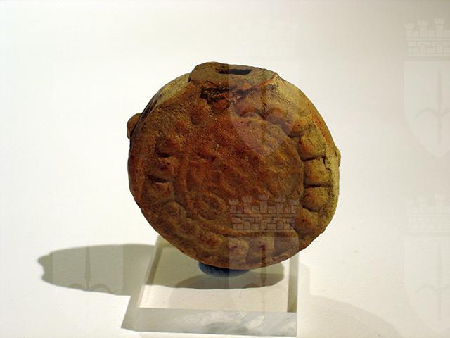 Ampolla piatta in argilla nocciola rosata, priva delle anse e del collo, ottenuta da matrice abbastanza fresca. Sul lato A, entro un disco piano sprovvisto di cornice, San Menas, con la testa circondata da un nimbo, è raffigurato in atteggiamento da orante, tra due cammelli che occupano per intero lo spazio a disposizione. Sul lato B, entro una cornice a globetti che circoscrive un anello appena rilevato, l’iscrizione su tre righe AΓI | OYMH | NA, che sta per “(eulogia) di San Menas”.