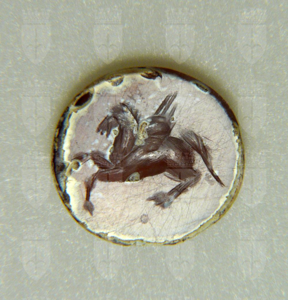 Gemma di forma tondeggiante, piana. Cavallo alato (Pegaso) in volo a sinistra.