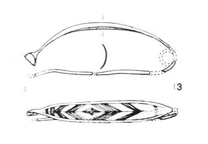 Frammento di fibula ad arco laminare decorato con motivi incisi a spina di pesce; breve staffa simmetrica.