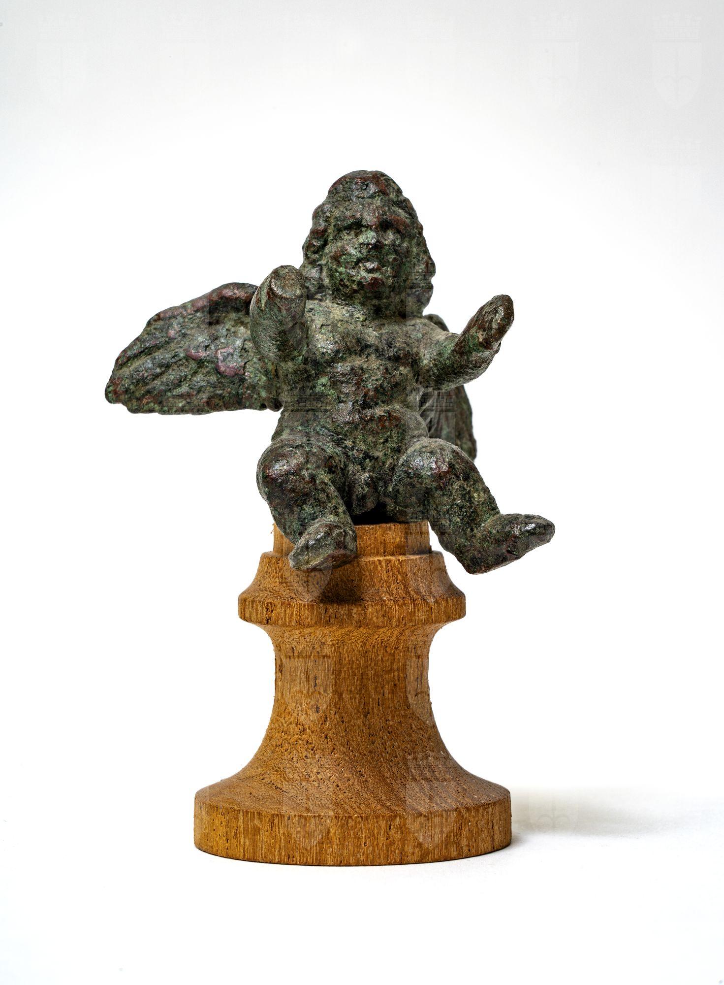 Statuetta d'Amorino, tozza e adiposa, è immaginata seduta su un rialzo con le gambe divaricate, la gamba sinistra distesa lateralmente, la destra piegata. Le braccia tese in avanti. Sulla schiena le ali aperte.