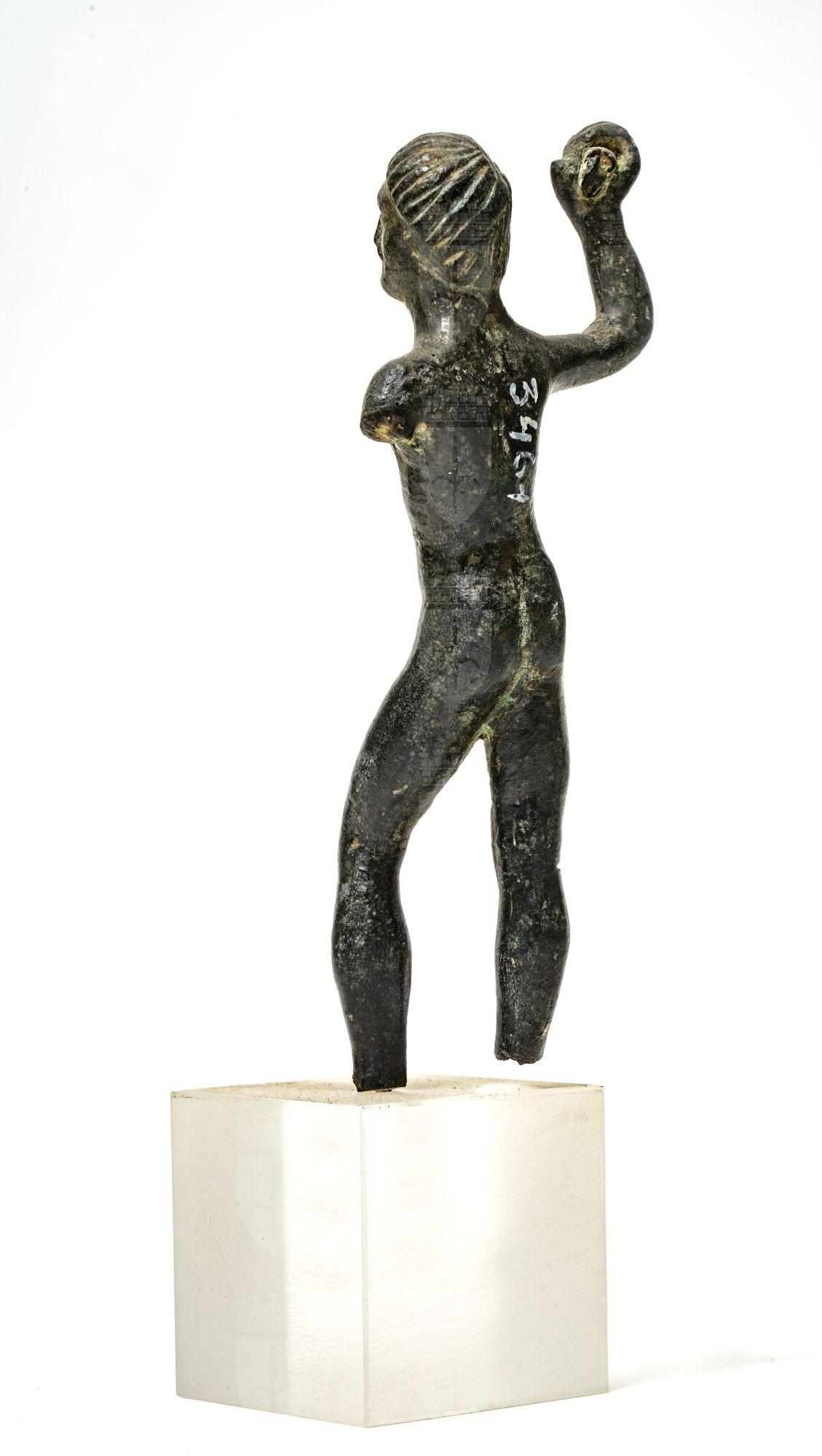 Statuina d'Ercole: il braccio destro è levato con in pugno il manico di una clava. Capelli a calotta e solchi. Fattura rozza, nessun accenno ai tratti anatomici del petto. Patina nera.