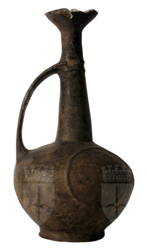 Brocchetta a corpo ovoide, leggermente appiattito, con piede ad anello rilevato, lungo collo conico, rastremato verso l'alto, e bocca ad imbuto, ansa verticale a nastro impostata tra il collo e la spalla. Colore grigio, con decorazione sul corpo con due costolature speculari che descrivono ampie spirali