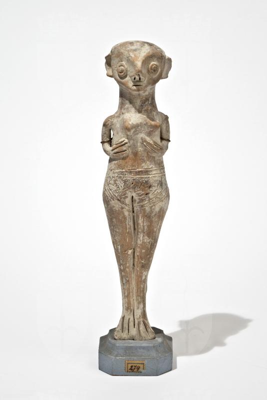 Idolo femminile rappresentante una donna in piedi con le mani sul petto, tipo della Venus Astarte. Lavorazione a mano libera modellata a tutto tondo; testa priva di parrucca, ampie orecchie, occhi circolari in rilievo, grande naso a becco, bocca segnata da un tratto; corpo stante con braccia sotto i seni; vita e cosce segnate da incisione a indicare un indumento: gambe affiancate terminanti in piedi a zampa con dita segnate da incisioni verticali. Residui di rivestitura bianca e tracce di colore.