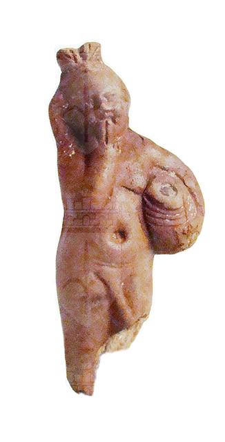 Il giovane dio si presenta stante, con il peso del corpo leggermente spostato sulla gamba sinistra in modo che l’anca destra sporga appena. Il braccio destro piegato porta due dita tese alla bocca, lieve variante alla tipica posizione di Arpocrate. Egli regge sotto il braccio sinistro un grande vaso rotondo a striature circolari o un cesto. Il capo rasato è coperto da una banda sormontata da due boccioli di loto. Sulla destra del volto la treccia di capelli. Il rilievo evidenzia le rotondità infantili all’inguine e al ginocchio e mette in risalto il lungo fallo del dio. La statuina è spezzata all’altezza delle ginocchia. Il retro lisciato ha grande foro rotondo per la miglior riuscita della cottura. L’interno è cavo.