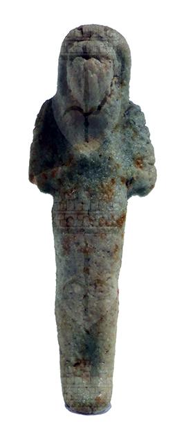 Statuina funeraria mummiforme che indossa una gonfia parrucca tripartita. Le mani non sono incrociate, ma affiancate, e reggono ognuna un attrezzo non identificabile. Gli avambracci sono segnati e le gambe sono distinguibili. È possibile che questo ushabti fungesse da amuleto. Sul retro, che è piatto a causa della mancata rifinitura, vi è qualche segno geroglifico.