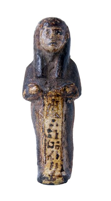 Statuina funeraria mummiforme. Indossa una parrucca tripartita nera. Le mani incrociate ed affiancate non sembrano reggere attrezzi. Il viso e le mani sono bianchi, il resto del corpo è quasi nero. L’iscrizione consta di una colonna di geroglifici, purtroppo quasi incomprensibile.