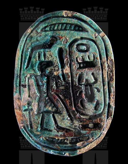 Scaraboide di aspetto alquanto insolito, sul cui ventre si vede una figura umana a testa di sciacallo in piedi davanti al cartiglio in disposizione verticale del prenome del faraone Thutmosi III, Men-kheper-ra. La figura tiene in mano una piuma; della decorazione fanno parte due segni neb, un serpente ed un segno ankh. Il dorso antropomorfo ritrae un uomo accucciato, con la testa girata di lato: si potrebbe interpretare come un prigioniero sottomesso. Foro passante longitudinale.
