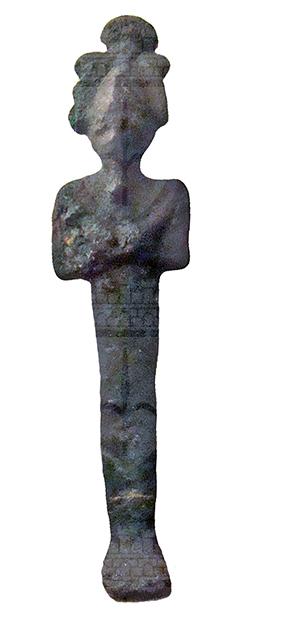 Amuleto in bronzo raffigurante il dio Osiride, dal modellato quasi filiforme. Secondo la consueta iconografia, il dio è raffigurato stante, con il corpo mummiforme da cui escono solo le mani, che reggono scettro e flagello, e la testa, sulla quale vi è la corona atef. Al mento vi è la solita barba divina posticcia. Sotto i piedi vi è un perno, attualmente inserito in una base di legno.
