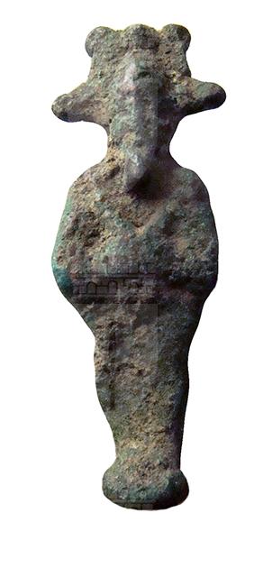 Amuleto in bronzo raffigurante il dio Osiride, dalla superficie molto consunta. Secondo la consueta iconografia, il dio è raffigurato stante, con il corpo mummiforme da cui escono solo le mani, che reggono scettro e flagello, e la testa, sulla quale vi è la corona atef. Al mento vi è la solita barba divina posticcia. Sotto i piedi vi è un perno, attualmente inserito in una base di legno.