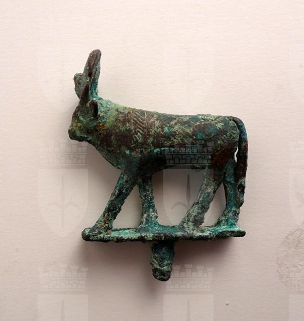 Bronzetto raffigurante un giovane torello incedente, con il disco solare tra le corna. La coda scende aderente alla zampa posteriore destra, le zampe poggiano su una piccola base, sotto la quale vi è un perno. Sulla groppa dell’animale si vedono, incisi sulla superficie, un disco solare alato e la gualdrappa.