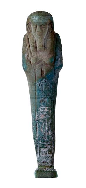 Statuina funeraria mummiforme che indossa una parrucca tripartita e la barba divina. Le mani incrociate e affiancate tengono ognuna una zappa. Una sacca pende dalla spalla sinistra. Il pilastro dorsale è presente, assieme ad una piccola base. L’iscrizione corre lungo una colonna frontale.