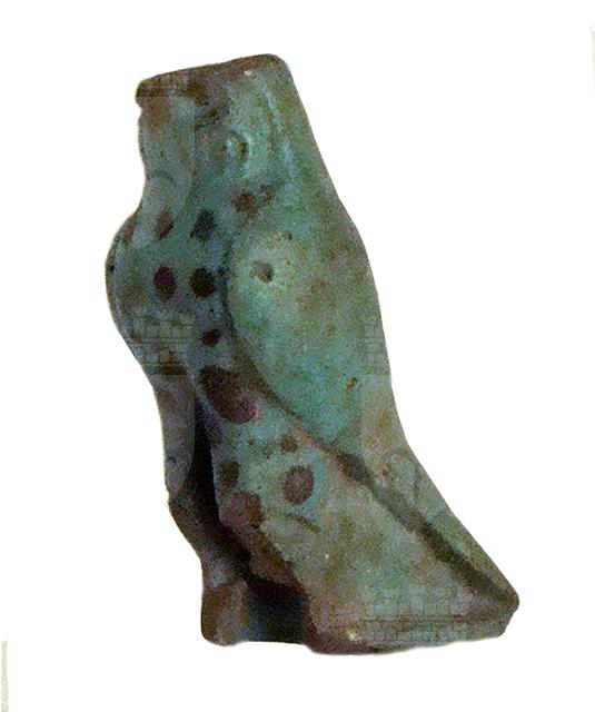 Piccola statuina in faience, forse con funzione di amuleto. Ipostasi del dio Horo, il falco è rappresentato in piedi, con la colorazione che imita il piumaggio naturale dei falchi. Sotto gli occhi vi è la consueta decorazione, fissata anche nella forma del geroglifico H 16 della lista dei segni di A. H. Gardiner, che riprende il disegno formato dalle piume di differente colore sotto gli occhi dei falchi.