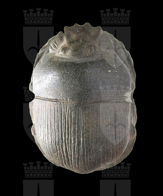 Scarabeo anepigrafe in serpentino, con il ventre liscio e privo di decorazione. Dorso con clipeo molto elaborato; divisione tra protorace ed elitre, le quali sono unite e presentano una zigrinatura verticale. In basso è visibile la forma dello scutello. Senza foro.