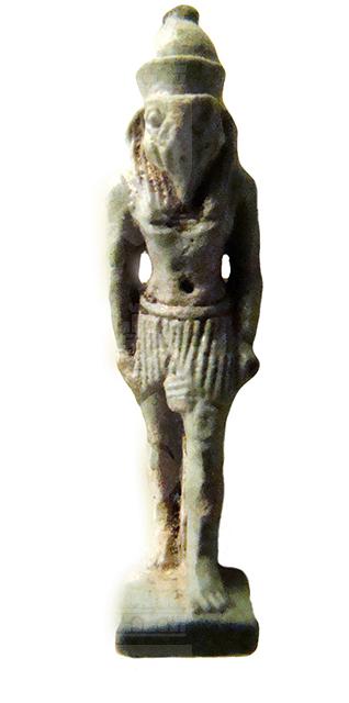 Bell'amuleto in faience raffigurante il dio Horus. Il dio è raffigurato in piedi, nell'atto di camminare (ha la gamba sinistra in avanti), con le braccia distese lungo il corpo e le mani chiuse a pugno. Il dio ha la consueta testa di falco, con un'ampia parrucca che ricade sulle spalle; sul capo ha la corona doppia dell'Alto e Basso Egitto; il corpo è nudo, ad eccezione del corto gonnellino pieghettato. I piedi poggiano su una base parallelepipeda che forma un tutt'uno con il pilastro dorsale, attraverso il quale c'è il foro passante per la sospensione.