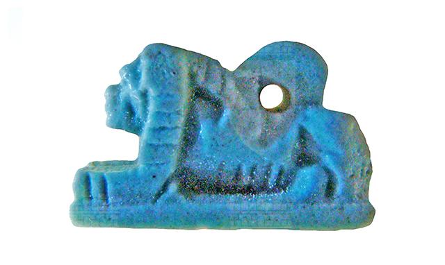Amuleto in faience lavorato a tutto tondo e in modo alquanto sommario, raffigurante un leone accucciato su una piccola base; sulla schiena vi è un anello di sospensione.