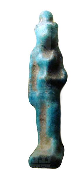 Amuleto in faience che raffigura la dea Sekhmet. L’iconografia è quella consueta, di donna con testa di leonessa. La dea è raffigurata stante, con il braccio sinistro piegato sul petto a reggere il lungo scettro wadj. Sul capo pare avere un disco solare. I piedi poggiano su una sottile base, che forma un tutt’uno con il pilastro dorsale, su cui sono incisi dei segni geroglifici, non comprensibili.