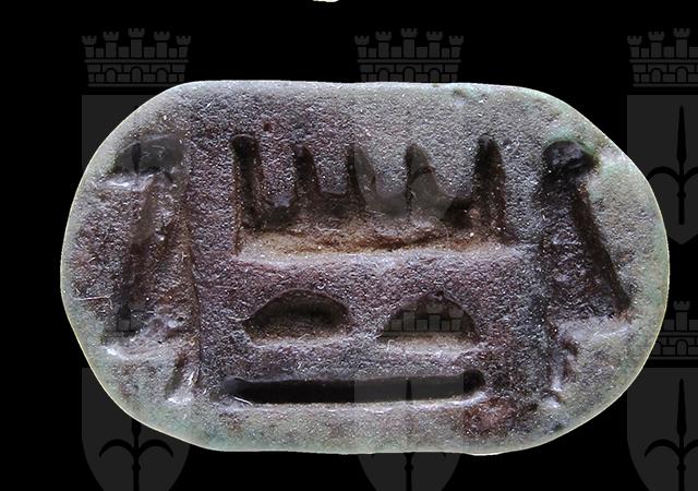 Sigillo in faience verde, con grafia corrotta del nome Amon-Ra, e il segno della canna fiorita raddoppiato. Dorso decorato da motivi vegetali stilizzati. Presa trasversale sul dorso.