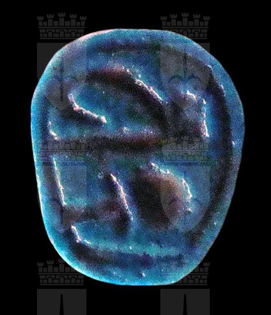 Scaraboide in faience turchese con sul ventre incisione dei segni geroglifici della corona rossa e dell’ankh, capovolti l’uno rispetto all’altro, all’interno di un bordo concentrico. Dorso con il volto della dea Hathor, con le orecchie bovine e la parrucca terminante in due riccioli. Foro passante longitudinale.