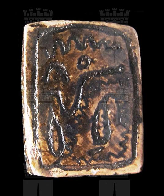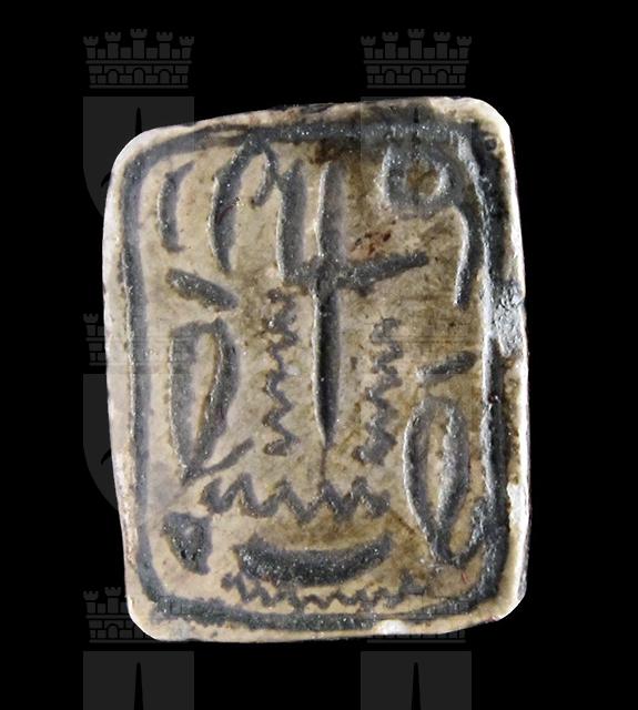 Piastra rettangolare in steatite marrone; su entrambe le facce sono presenti incisioni di segni geroglifici stilizzati, disposti senza un ordine apparente, il che non ne consente la lettura. Sono presenti delle serpentine come riempitivo. Foro passante longitudinale. Autenticità dubbia.