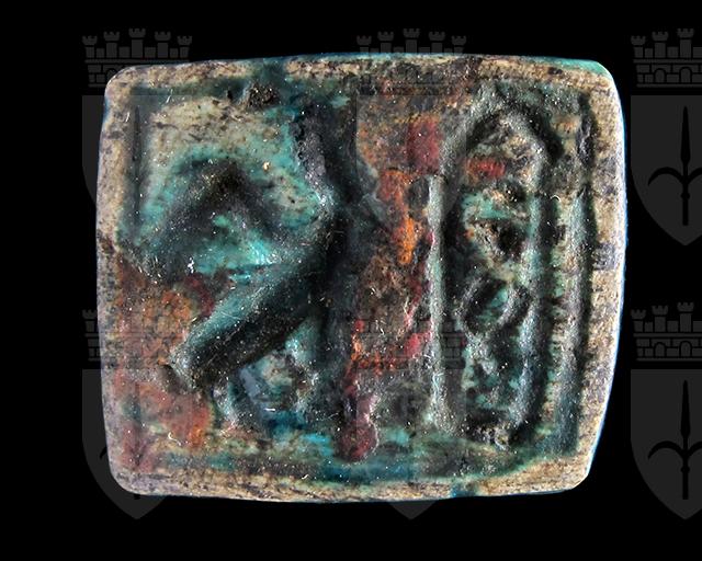 Piastra rettangolare in steatite invetriata turchese; Su una faccia sono presenti un cartiglio indecifrabile disposto verticalmente ed un falco con corona e flagello. Sull’altra, forse un animale (non ben visibile a causa della scheggiatura dell’angolo) ed alcuni segni. Foro passante longitudinale.