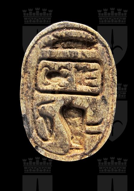 Scarabeo in steatite marrone; sul ventre, sotto un segno neb rovesciato si vede uno pseudo cartiglio imitante quelli col prenome di Thutmosi III in disposizione orizzontale, dal quale pende a sinistra un ureo. Davanti a questo vi è un falco molto stilizzato disposto perpendicolarmente rispetto al resto della decorazione. Dorso con clipeo; protorace ed elitre separati da incisione a T. Foro passante longitudinale.