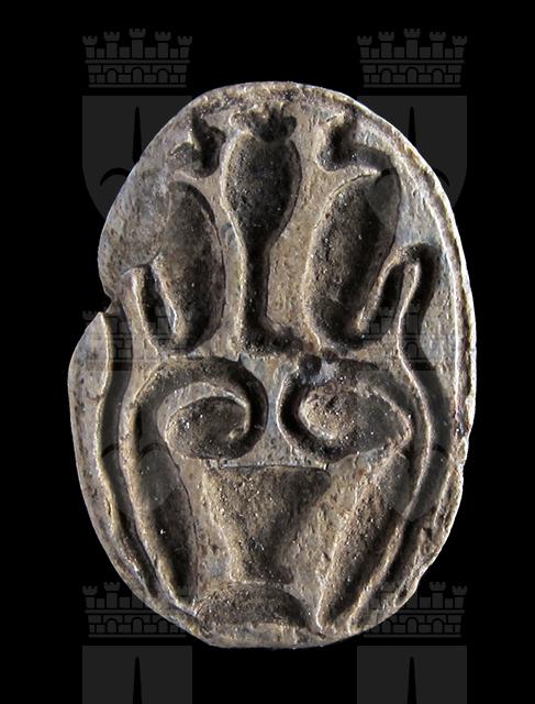 Scarabeo in steatite grigia, con sul ventre incisione di segni geroglifici disposti simmetricamente: si riconoscono due urei con lunga coda ai lati di un vaso hes. Dorso con clipeo ed incisione a T che divide il protorace dalle elitre. Foro passante longitudinale.