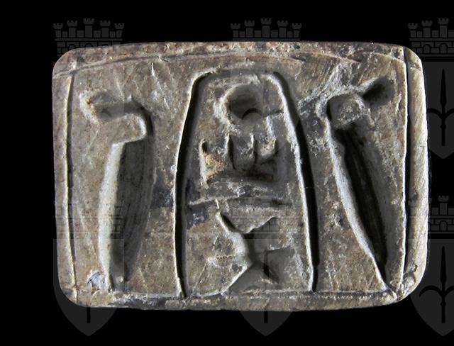 Sigillo in steatite. Su una faccia si vede il cartiglio col prenome di Thutmosi III in disposizione verticale, affiancato da due urei. Sull’altra sono raffigurate a rilievo quattro rane, simbolo di fecondità. Foro passante longitudinale.