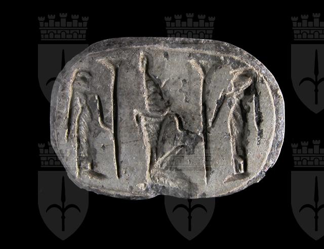Scarabeo in steatite grigia con sul ventre una rappresentazione del faraone con la corona bianca dell’Alto Egitto genuflesso tra due divinità femminili che reggono lo scettro uag. Dorso con clipeo stilizzato, doppia divisione orizzontale tra protorace ed elitre, piccola incisione a V sopra la divisione delle elitre e tacche a V laterali. Foro passante longitudinale.