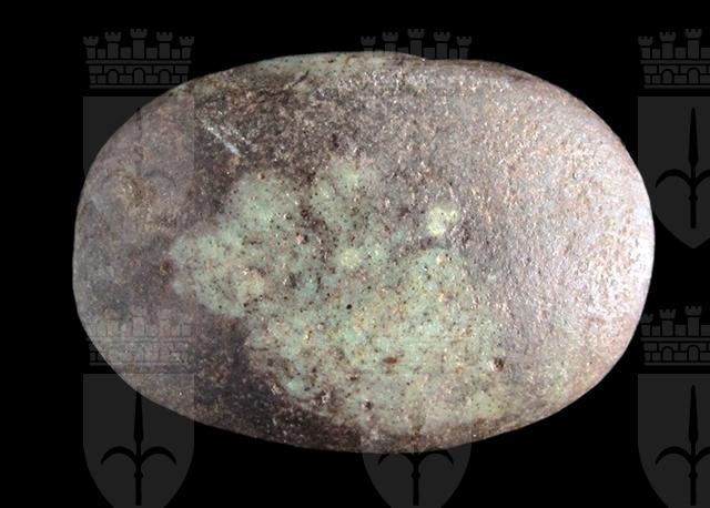 Scaraboide in faience; Sul ventre è rappresentata una sfinge alata con accanto segni geroglifici. Il dorso è molto consumato ed ormai liscio; il colore originale doveva essere verde chiaro. Foro passante longitudinale.