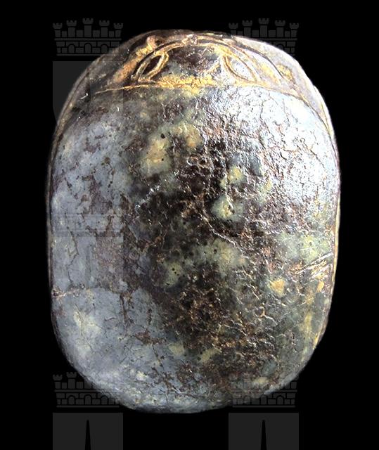 Scarabeo in serpentino con sul ventre incisione di segni geroglifici, la cui lettura “buon signore” resta dubbia, al centro di una decorazione a spirali. Dorso molto stilizzato con appena visibili lievi incisioni sul clipeo. Foro passante longitudinale.