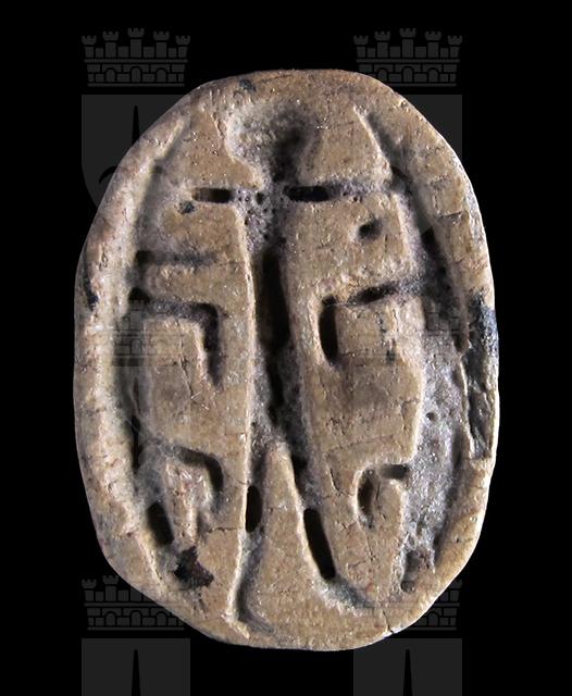 Scarabeo in steatite grigia con sul ventre rappresentazione di un uomo che tiene due coccodrilli per la coda. Dorso con lavorazione del clipeo e incisione a T che separa protorace ed elitre. Foro passante longitudinale.