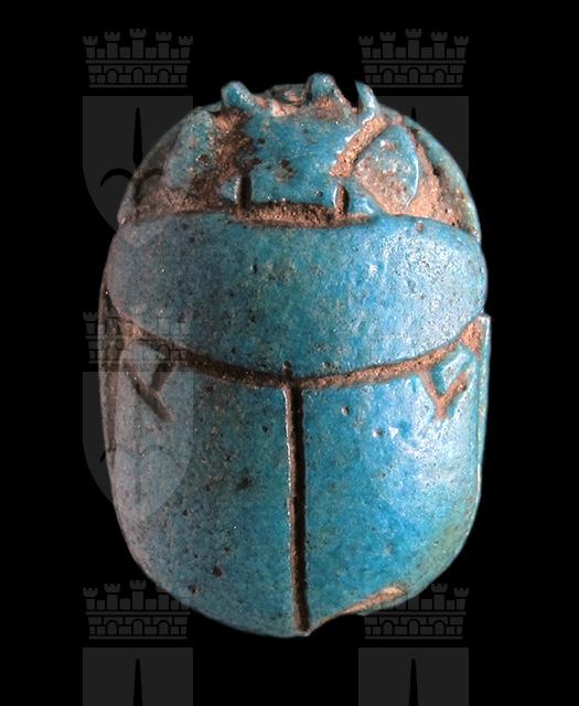 Scarabeo in faience turchese, con sul entre raffigurazione di un ugiat, sotto il quale vi è a destra un segno nefer e a sinistra il segno dell’uomo seduto con la mano alla bocca; si tratta forse dell’augurio “Salute e bene!”. Dorso con clipeo ed incisione a T per dividere il protorace e le elitre che presentano tacche a V. Foro passante longitudinale.