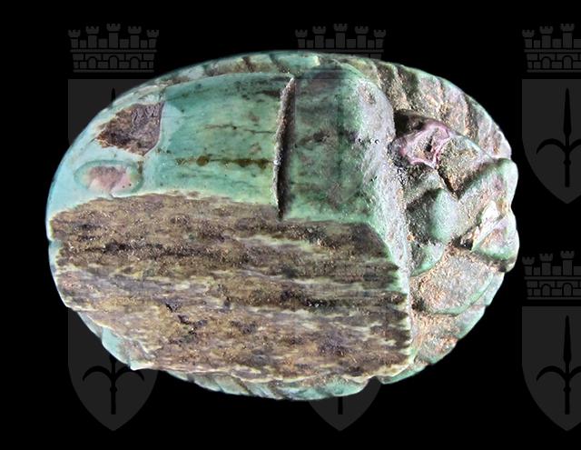 Scarabeo in steatite invetriata turchese con sul ventre incisione crittografica del nome di Amon-Ra. Sul dorso si intravedono le incisioni di clipeo, protorace ed elitre. Foro passante longitudinale.