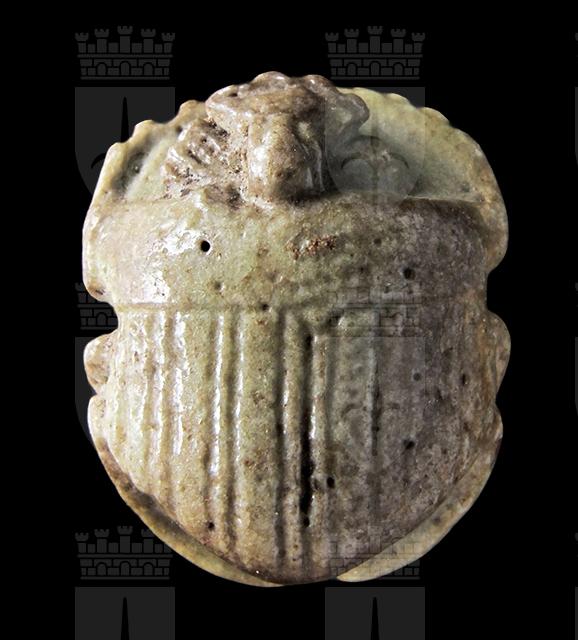 Scarabeo zoomorfo in faience verde. Dorso con clipeo e lavorazione ondulata sulla testa, visibile anche dal ventre; elitre non separate, con zigrinature verticali. Ventre con le zampe ripiegate ed una piccola presa trasversale al centro.