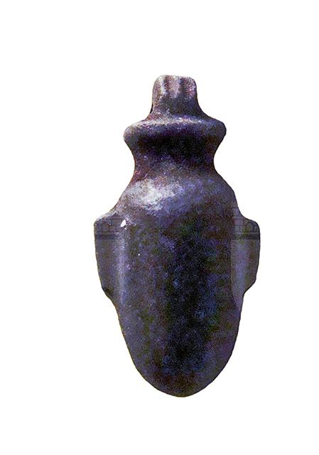 Amuleto in pietra lavorato a tutto tondo, con anello di sospensione nella parte superiore. Raffigura il geroglifico "ib", vale a dire il "cuore", con la massa ovoide centrale e le terminazioni dei tre vasi sanguigni (due sui lati e una in alto); vista l'importanza di quest'organo nel giudizio dei defunti nell'aldilà, un tale amuleto veniva posto tra le bende delle mummie per evitare che il vero cuore venisse rapito.