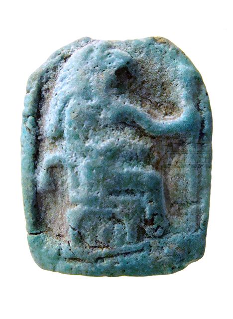 Amuleto in faience che ha la forma di una stele centinata. All'interno di un bordo rilevato, vi è una raffigurazione a rilievo della dea Sekhmet. L’iconografia è quella consueta, di donna con testa di leonessa. La dea è raffigurata di profilo, seduta su un trono a basso schienale; nella mano sinistra regge un lungo scettro wadj.