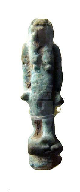 Amuleto in faience raffigurante la divinità apotropaica Toeris, patrona delle partorienti e dei neonati. La dea è raffigurata in piedi, con il muso di coccodrillo, una lunga parrucca, il corpo da ippopotamo gravido, con le braccia distese lungo il corpo. I piedi poggiano su una base parallelepipeda, mentre il dorso con la coda da coccodrillo si fonde con il pilastro dorsale, forato per permettere la sospensione dell'amuleto.