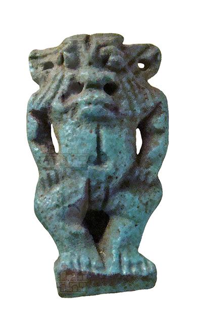 Amuleto in faience raffigurante la divinità apotropaica Bes. Il dio è raffigurato nel suo aspetto consueto: con il corpo tozzo e le gambe arcuate, le braccia appoggiate sulle cosce, il volto frontale con le orecchie sporgenti, le sopracciglia evidenziate, la barba e il grande naso piatto. Sul capo manca la consueta corona di piume di struzzo, mentre i piedi poggiano su una piccola base quadrangolare.