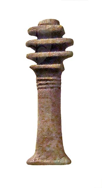 Amuleto in faience, con pilastro dorsale forato, che raffigura il geroglifico "djed", a forma di pilastro con quattro espansioni nella parte superiore, che indica stabilità, immutabilità, eternità, resurrezione, ma anche forza inestinguibile ed incorruttibilità. Già nella Prima Dinastia (3150 – 2925 a.C.) era un pilastro intorno al quale venivano legate spighe di grano; dal Nuovo Regno (1543 – 1078 a.C.) fu interpretato anche come spina dorsale di Osiride. Un djed, meglio se in oro, era posto sulla gola del defunto durante il suo funerale, con il compito di farlo divenire uno spirito santificato e perfetto, un seguace di Osiride. Nel capitolo 155 del Libro dei Morti l’amuleto fa sì che “è tua nuovamente la tua spina dorsale e le tue vertebre, così che puoi tornare a muoverti...”.